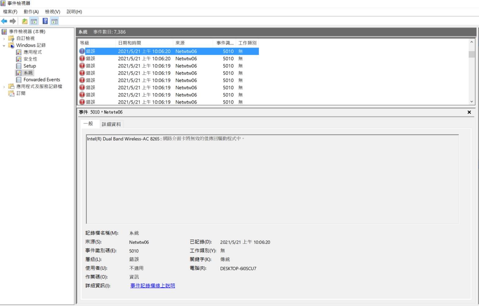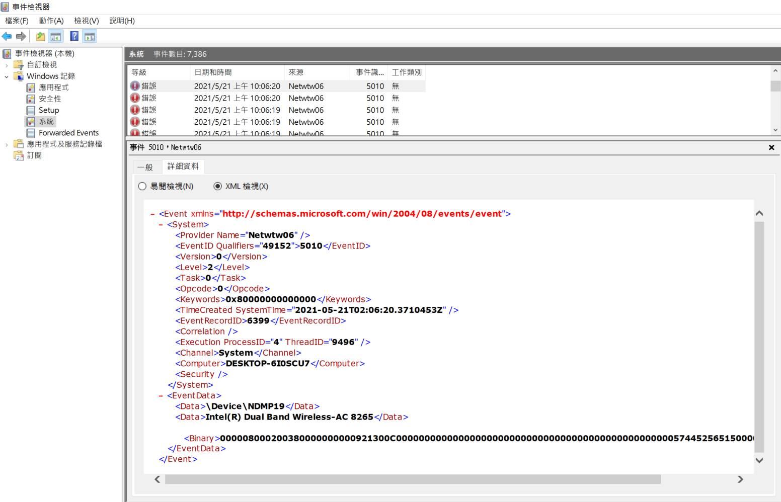 自從4月中突然更新至Windows 20H2版本之後,開始出現wifi斷線的情形。發生的頻率不是太固定,有時候一整天只發生一次,有時剛開機沒多久就連續發生;斷線之後手動重啟wifi選項皆無反應,有時甚至會導致藍屏,並顯示停止代碼: Driver_IRQL_NOT_LESS_OR_EQUAL ;失敗的項目:Netwtw06.sys。藍屏後系統重啟偶爾能暫時解決上網問題,但過一兩天又會發生;我到事件檢視器中查看Windows記錄/系統,會找到一整排的 等級:錯誤Intel(R) Dual Band Wireless-AC 8265 : 網路介面卡將無效的值傳回驅動程式中。(如圖)