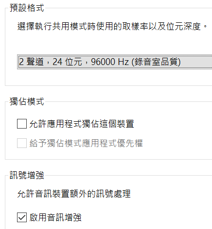 有試過加大增量、關閉允許獨佔、音訊增強、尋找是否可更新驅動程式等等的做法,但都沒用。