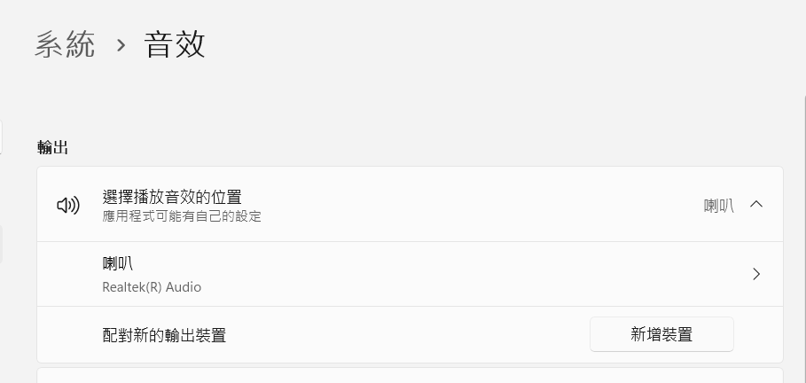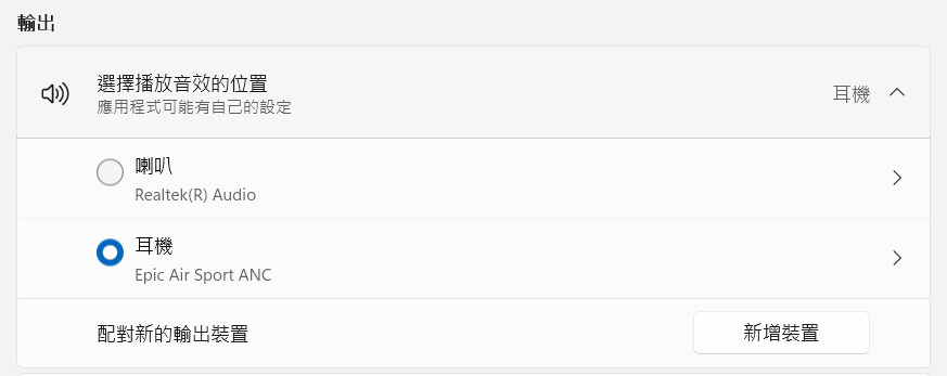 4.移除藍芽裝置之後,到系統>音效>配對新的輸出裝置,配對連線耳機後還是無法使用