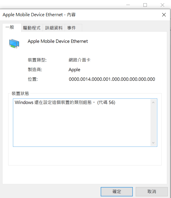 現在是無線上網的方式作備用,而且在裝置管理員看到apple mobile device ethernet 的內容中有Windows 還在設定這個裝置的類別組態。 (代碼 56)