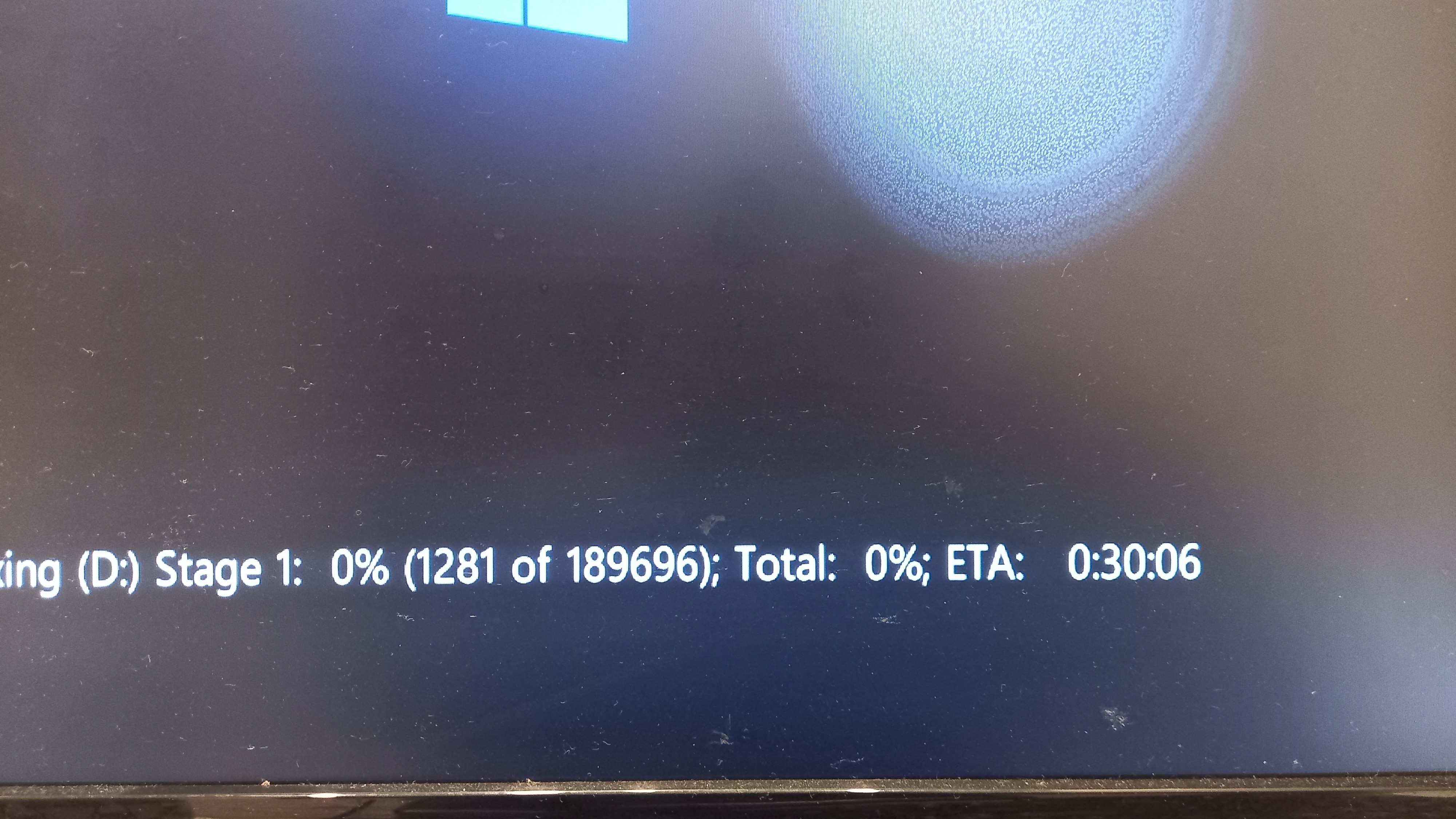 看到你提供的截圖,"ing (D:) Stage 1: 0% (1281 of 189696) Total: 0%; ETA: 0:30:06"