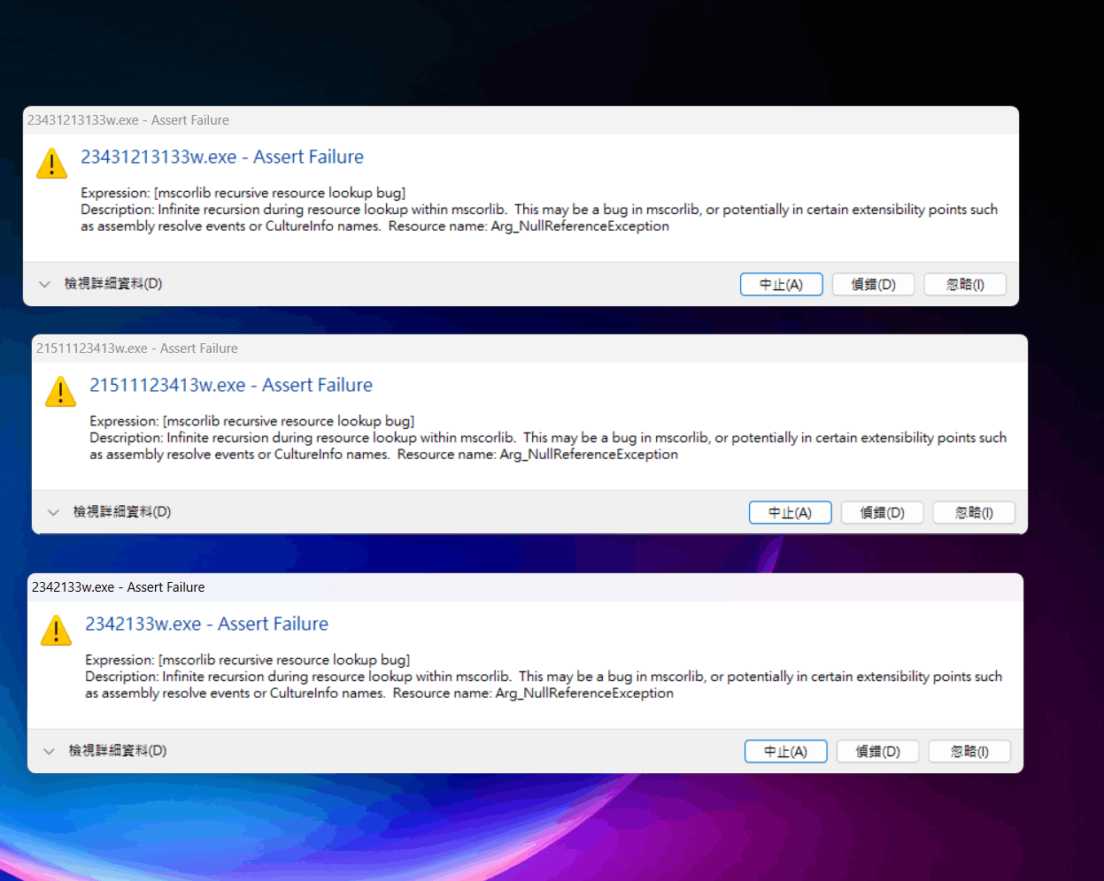 今天我剛打開電腦就發現這三個奇怪的視窗一直跳出來,就算你按中止跟忽略他還是會一直跳出來,按偵錯的時候他提示要去just-in-time Debugger?我去找了很久發現我的visual studio 裡沒這個功能,請問有什麼有效的解決方案嗎?我快被它們煩死了....