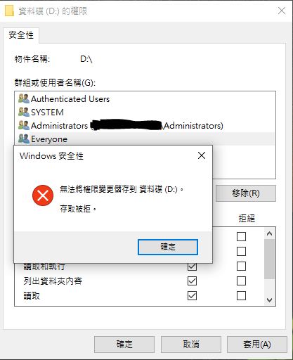 有試著修改D槽的擁有者,但也沒有權限修改