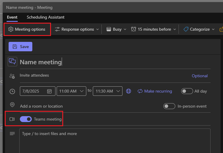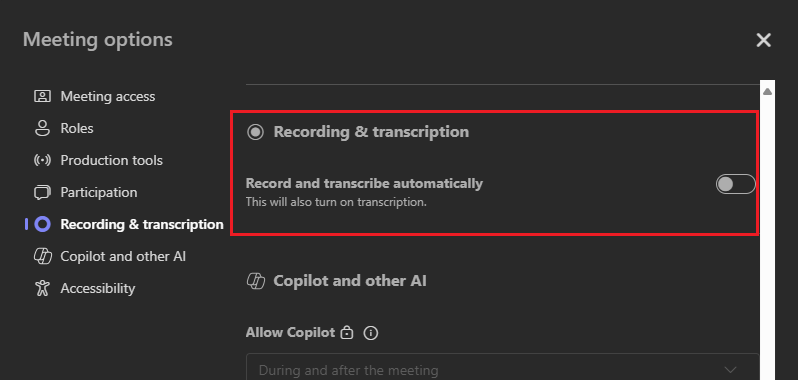 - 要在不手動按兩下的情況下進行即時轉錄,請將會議設置為自動錄製:
