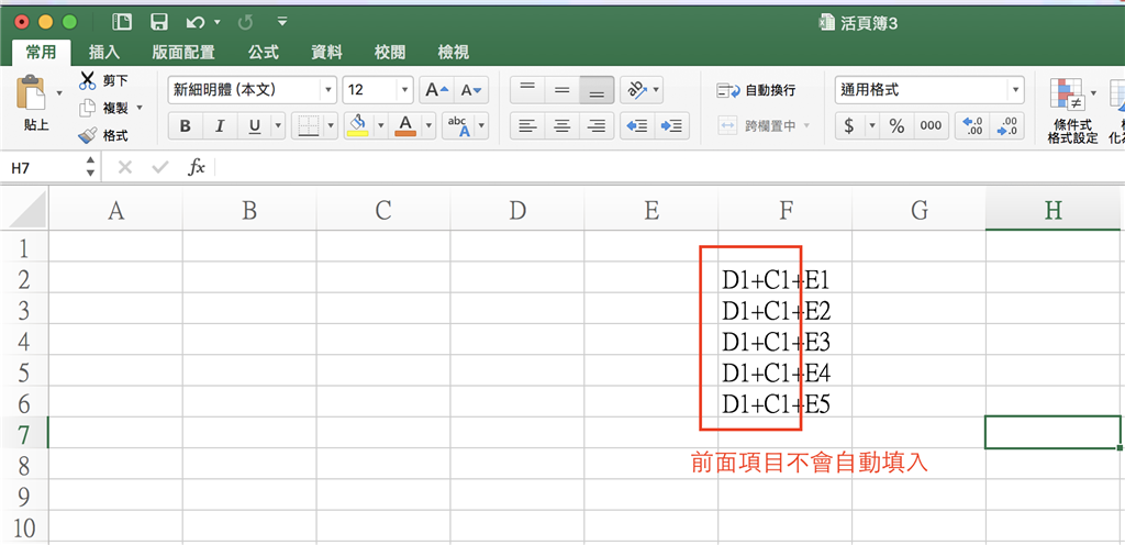我想要在我往下拉的同時D3+F3 自動幫我帶成D4+F4, D5+F5...依此類推,可是我試了很多次 只有後面的F5 會被自動帶值,前項則是固定的,請問有辦法可以解決嗎?