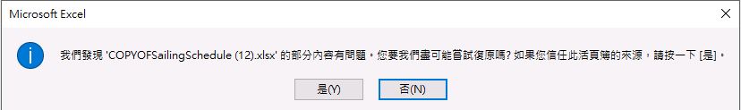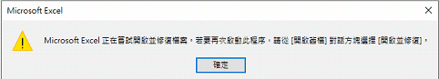 你好,我公司有一份Excel用Excel 2016打開,但顯示要修復(圖1)才可開啟。當我按是的按鈕去修復後,會出現圖2的Message box,按確定後,Excel並沒有任何的動作!然後我跟隨圖2所示,再按[開啟舊檔]對話方塊選擇[開啟並修復],然後出現圖3的Message box,按了修復按鈕,但也是一樣Excel並沒有任何的動作!