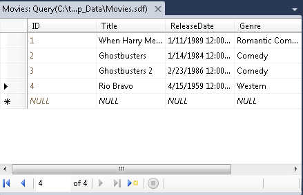 有兩個資料表,一個用於 Movie 實體集,還有一個是 EdmMetadata 資料表。 Entity Framework 會使用 EdmMetadata 資料表判斷模型和資料庫的同步時機。