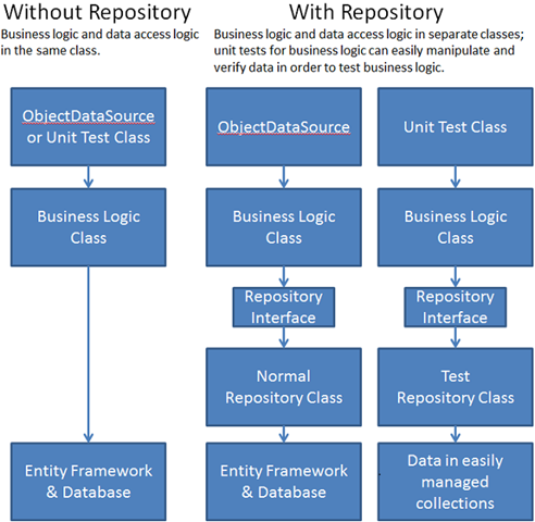 下圖顯示商務邏輯類別之間的差異,該類別包含不含存放庫的資料存取邏輯,以及使用存放庫的邏輯。