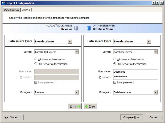 SQL 比較會比較和同步處理兩個資料庫 架構。 不幸的是,它不會比較和同步處理兩個資料庫數據表中的數據。 Red Gate Software 提供名為 SQL Data Compare 的產品,可比較和同步處理兩個資料庫之間的數據,但這是與 SQL Compare 不同的產品,且成本另一 $395。