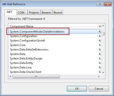 在 方案總管 中,以滑鼠右鍵按兩下 ContosoUniversity 專案,選取 [新增參考],然後新增對 的System.ComponentModel.DataAnnotations參考。
