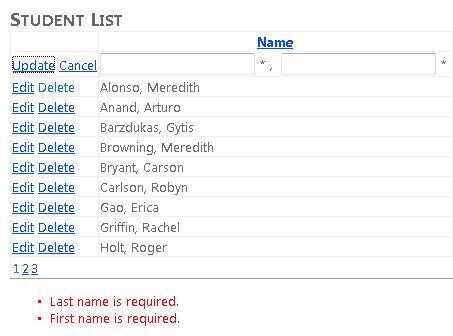 若要查看運作方式,您將變更用來在現有 Students.aspx 頁面中顯示和編輯欄位的控件,並將格式設定和驗證元數據新增至實體類型的名稱和日期欄位 Student 。