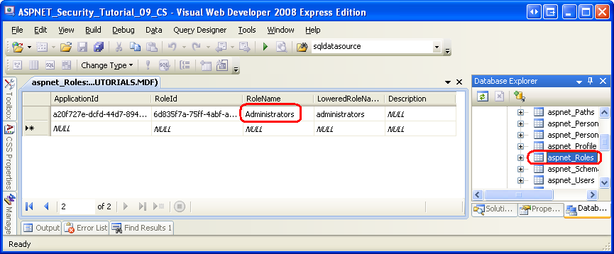 SqlRoleProvider已註冊提供者並設定其connectionStringName設定為指向SecurityTutorials.mdf資料庫。這是我在SQL Server教學課程中建立成員資格架構中建議和使用 的方法,也是在本教學課程中使用的方法。