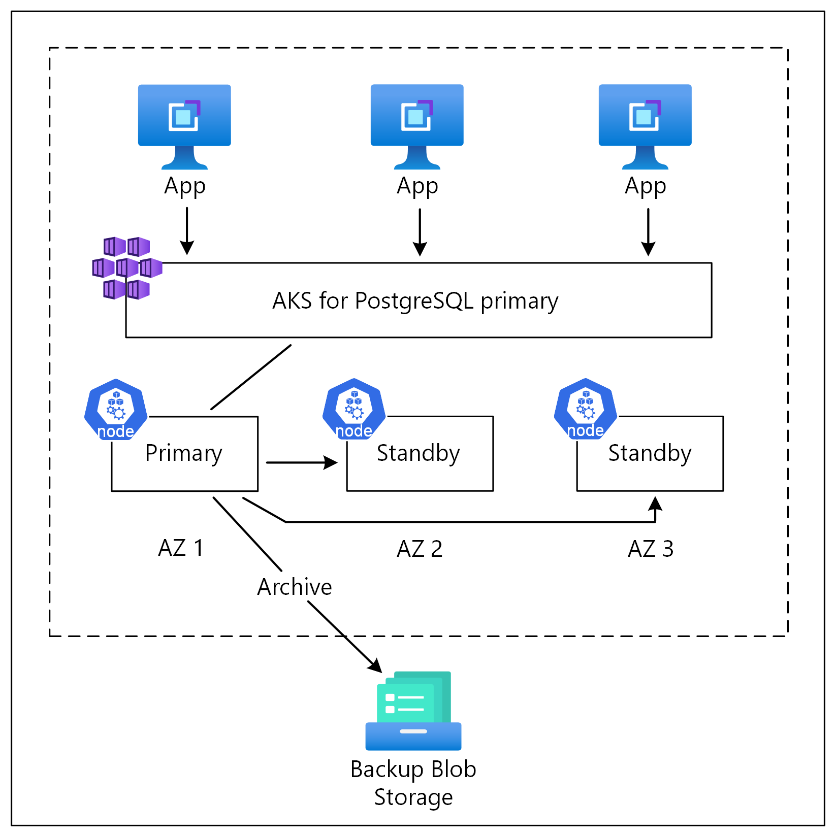 此圖說明 PostgreSQL 叢集設定,其中一個主要複本和兩個讀取複本是由 CloudNativePG (CNPG) 運算子所管理。 此架構提供在 AKS 叢集上執行的高可用性 PostgreSQL,可透過跨複本故障轉移來承受區域中斷。