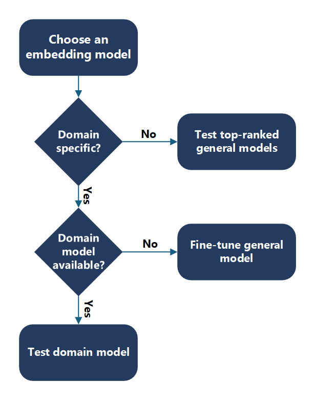 當你選擇一般嵌入模型時,先從 Hugging Face 排行榜 模型排名開始。 評估模型如何與您的數據搭配運作,並從最上層模型開始。