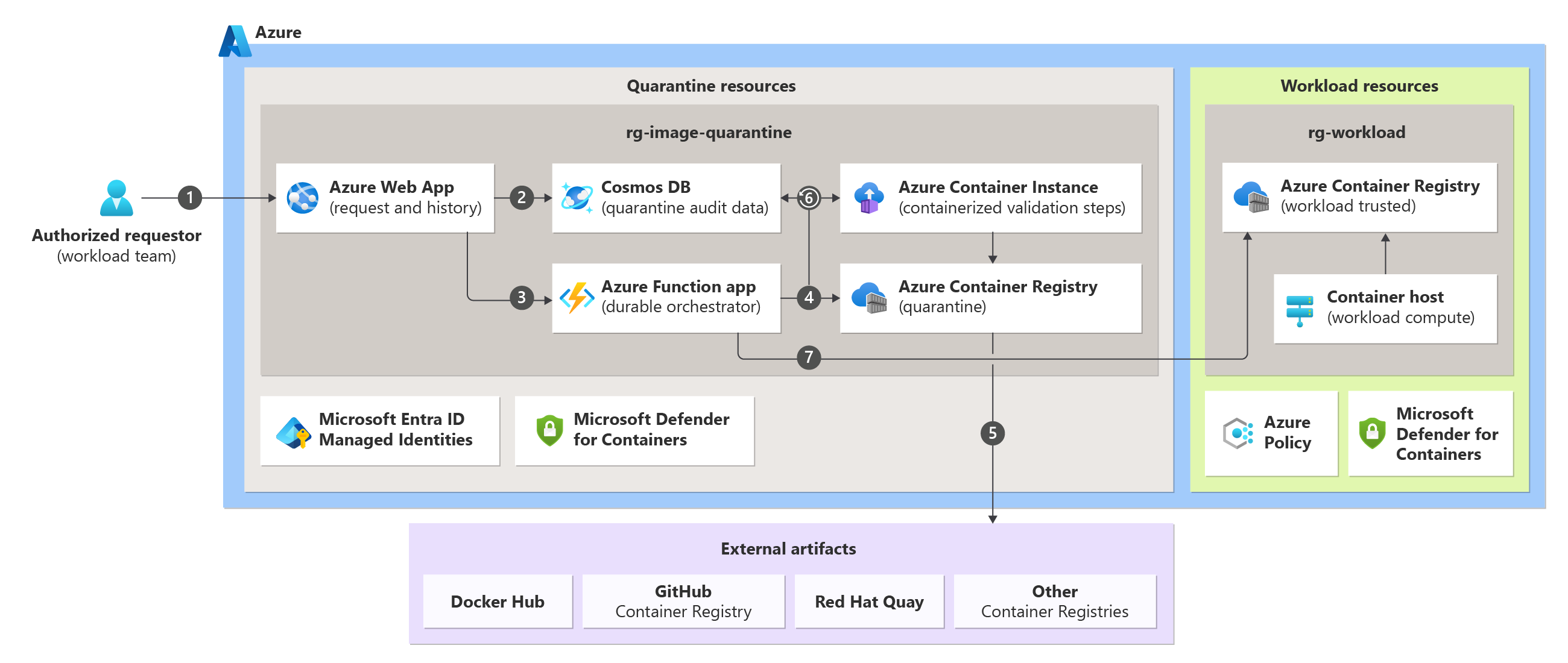 工作負載小組會在檢閱結果之後做出決策。 如果結果符合其風險承受能力,則會將映像從隔離存放庫提取到其容器實例。 當此模式用來支援具有不同安全性風險承受能力的多個工作負載小組時,此提取模型更為實用。
