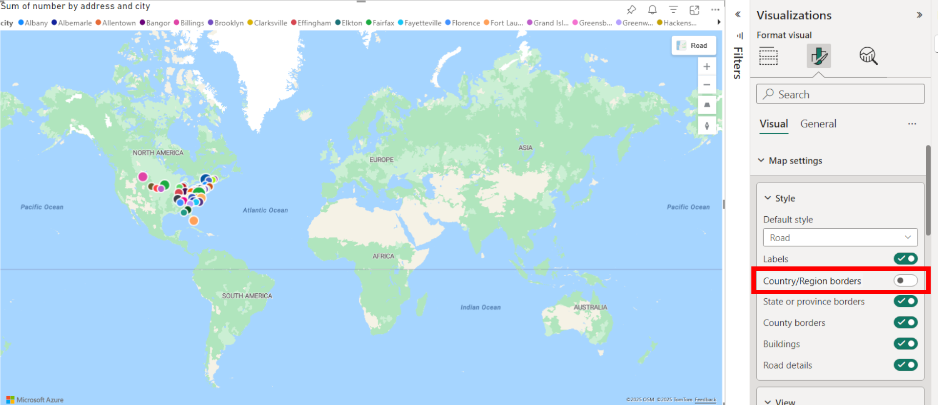 | 標籤 | 可讓您顯示或隱藏地圖卷標的切換開關。 如需詳細資訊,請參閱上一節標題為 使用 Azure 地圖服務 Power BI 視覺效果的項目編號 5。 |