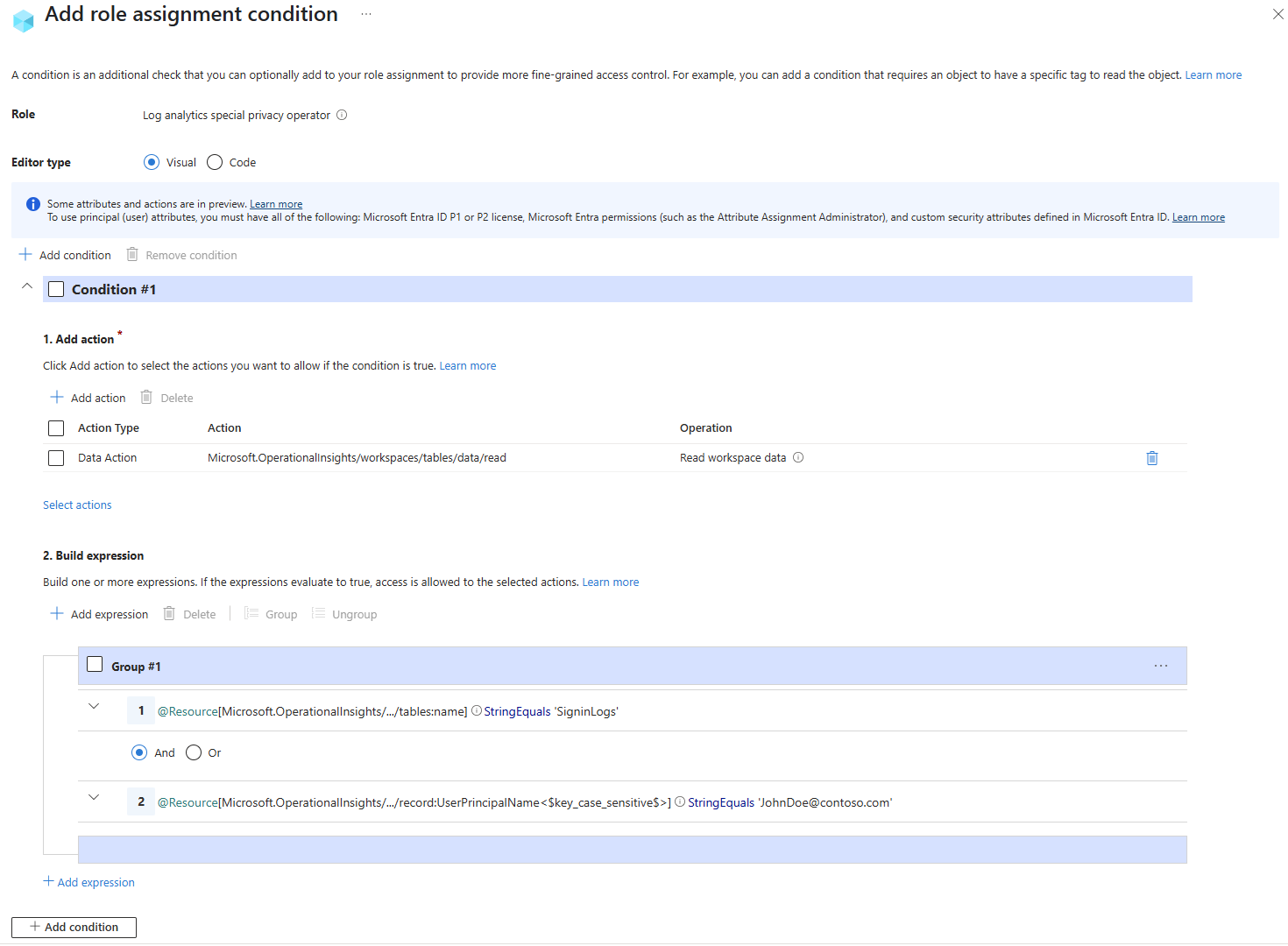 Microsoft.OperationalInsights/workspaces/tables/data/read。 使用數據動作定義角色的條件。