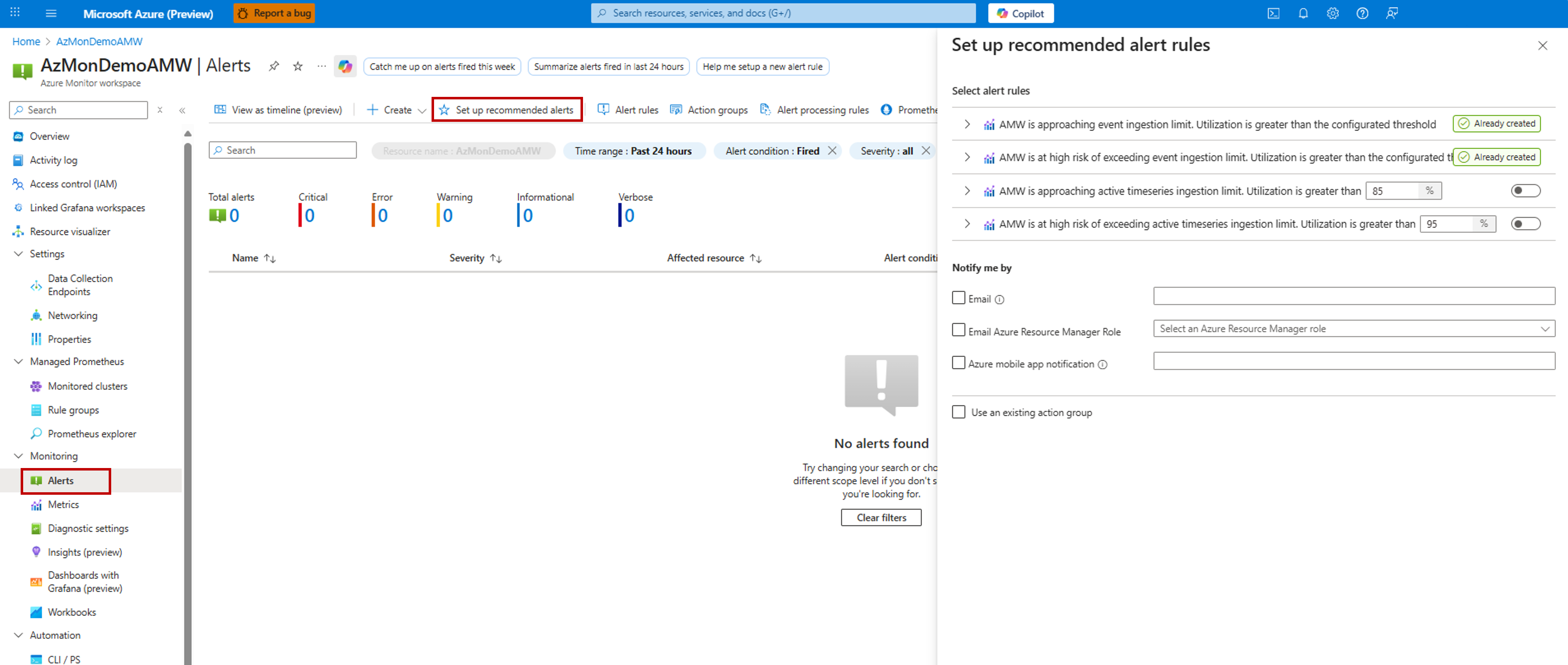 若要啟用建議的警示規則,請流覽至 Azure 入口網站中的 Azure 監視器工作區。