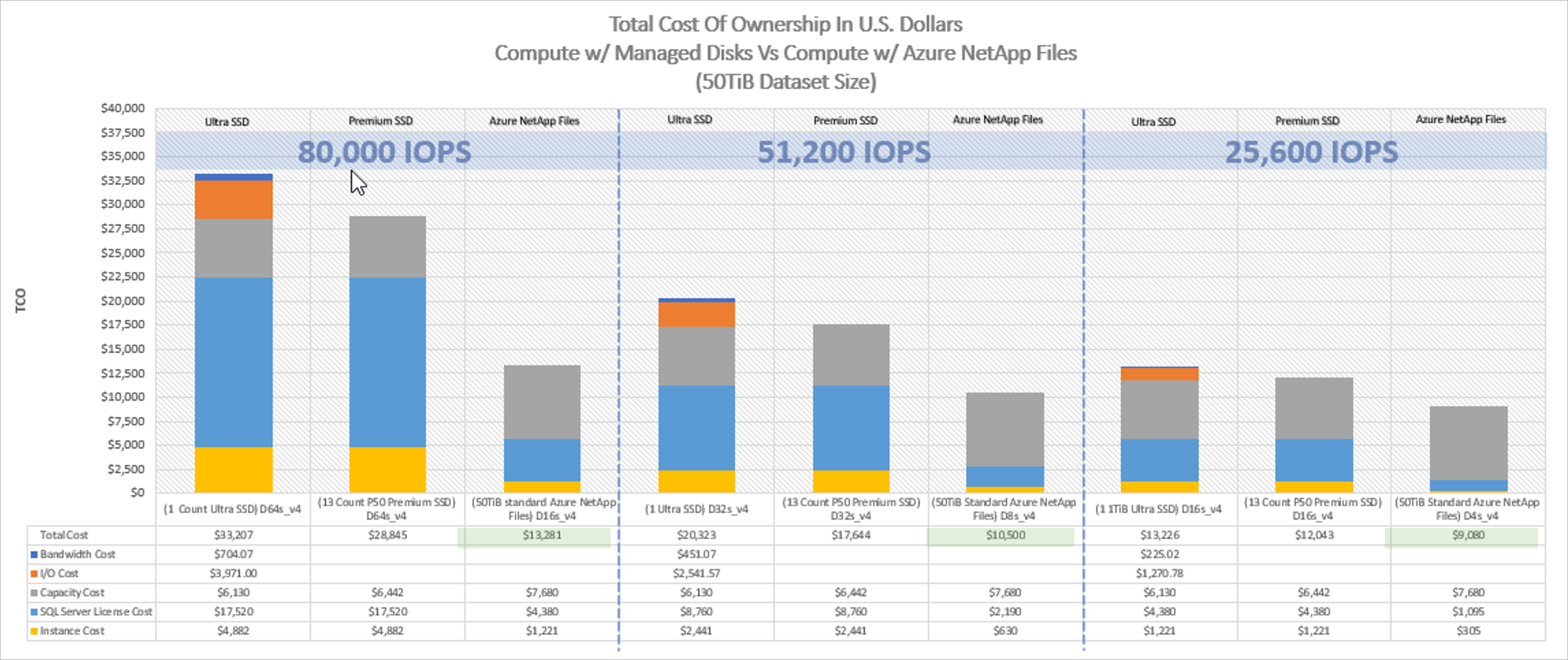相較於區塊儲存體解決方案,Azure NetApp Files 可降低 SQL Server 擁有權總成本 (TCO)。 使用區塊記憶體時,虛擬機(VM)已對磁碟作業的 I/O 和頻寬施加限制。 系統僅會針對 Azure NetApp Files 套用網路頻寬限制,而且只會套用至該處的輸出。 換句話說,系統不會針對 Azure NetApp Files 套用 VM 層級 I/O 限制。 如果沒有這些 I/O 限制,在連線至 Azure NetApp Files 的較小虛擬機器上執行的 SQL Server,其效能可以與在大型虛擬機器上執行的 SQL Server 一樣良好。 如此將執行個體調小,可將計算成本減少為先前價格的 25%。 您可以透過 Azure NetApp Files 來降低計算成本。