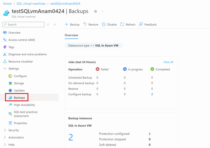若要取得已設定備份的概觀和備份作業的摘要,請移至 SQL VM 資源中的 [設定]>[備份]。