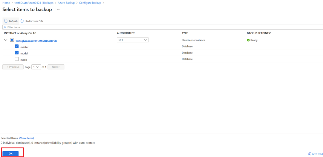 在 [選取要備份的項目] 上,展開該執行個體或 Always On 可用性群組中所有未受保護的資料庫清單。
