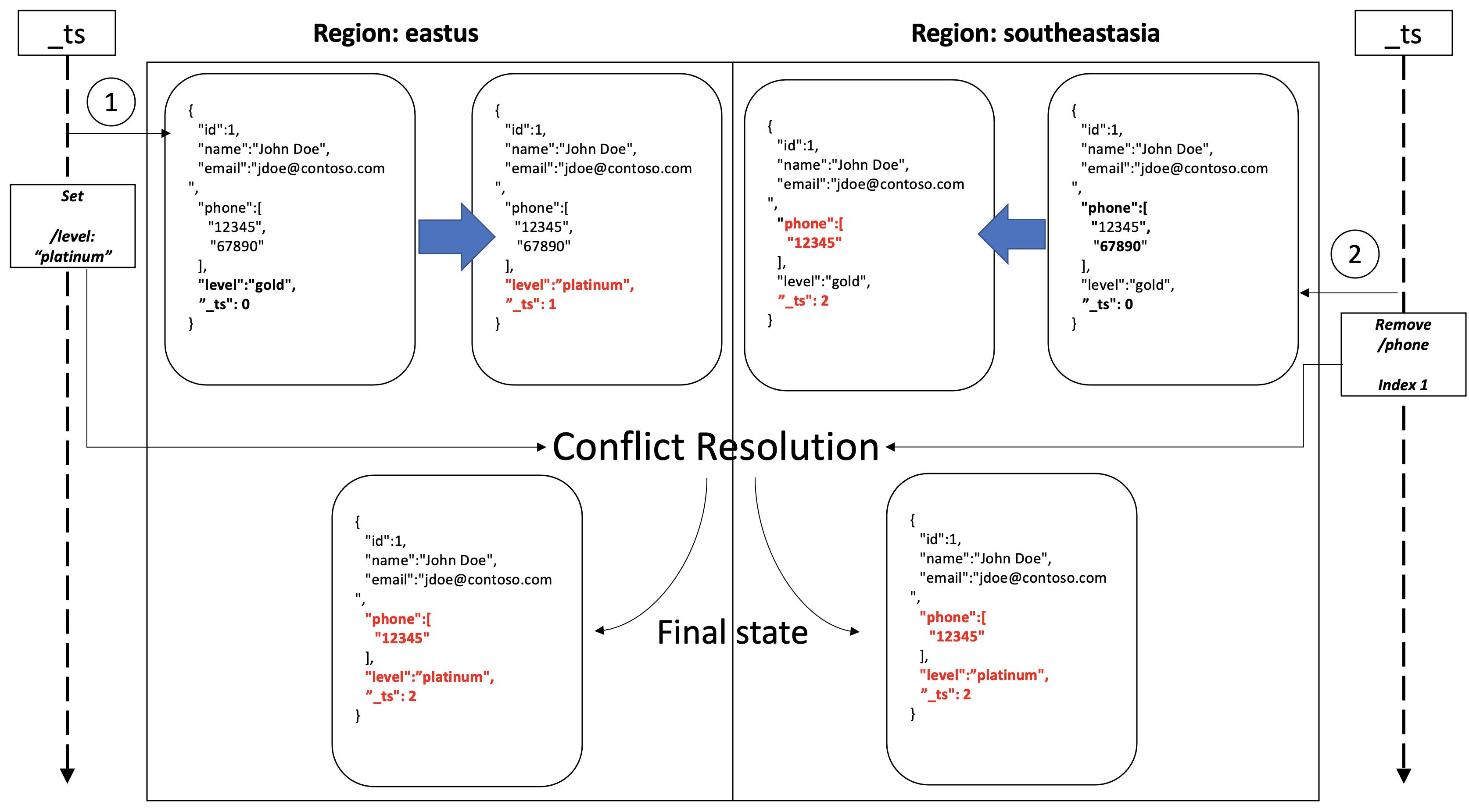 如果您的 Azure Cosmos DB 帳戶已設定為多個寫入區域,衝突和衝突解決策略適用於文件層級,「最後寫入者勝出」(LWW)是預設衝突解決策略。 針對部分文件更新,跨多個區域的修補作業會偵測並解決在更細微路徑等級上的衝突。