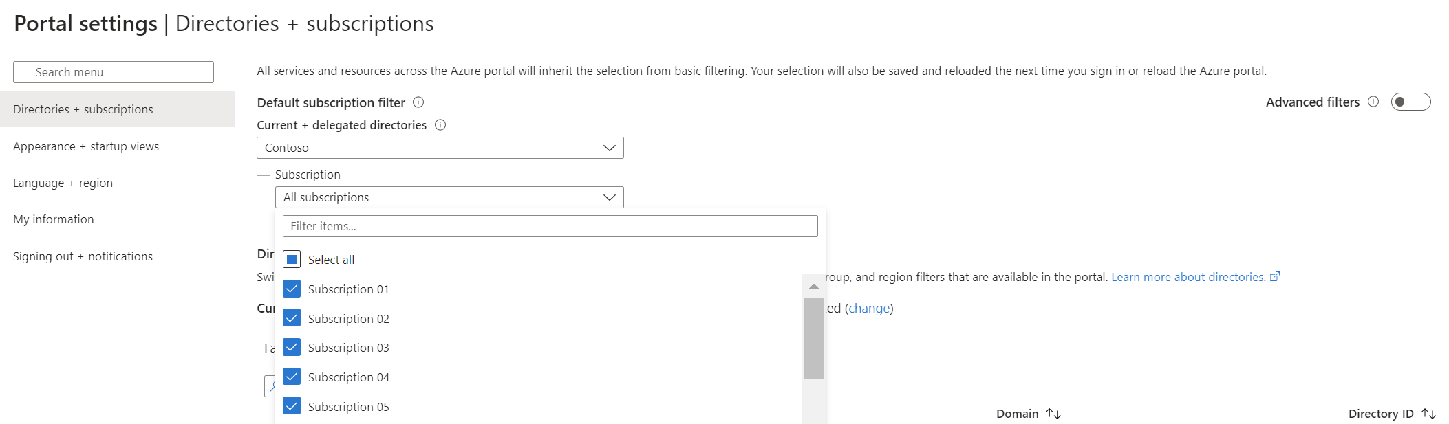 - 在 [入口網站設定 | 目錄 + 訂用帳戶] 頁面的 [預設訂用帳戶] 篩選底下,選取 [全選] 選項,或選取訂用帳戶的子集。