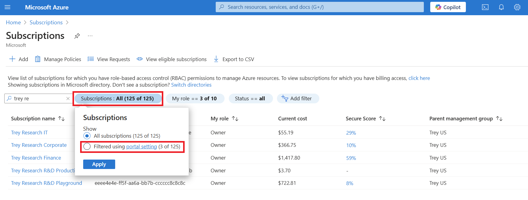 當您在 [訂用帳戶] 頁面上檢視訂用帳戶時,您會看到您有權存取的訂用帳戶清單。 有兩種篩選會影響您在 [訂用帳戶] 頁面上檢視訂用帳戶清單的方式: