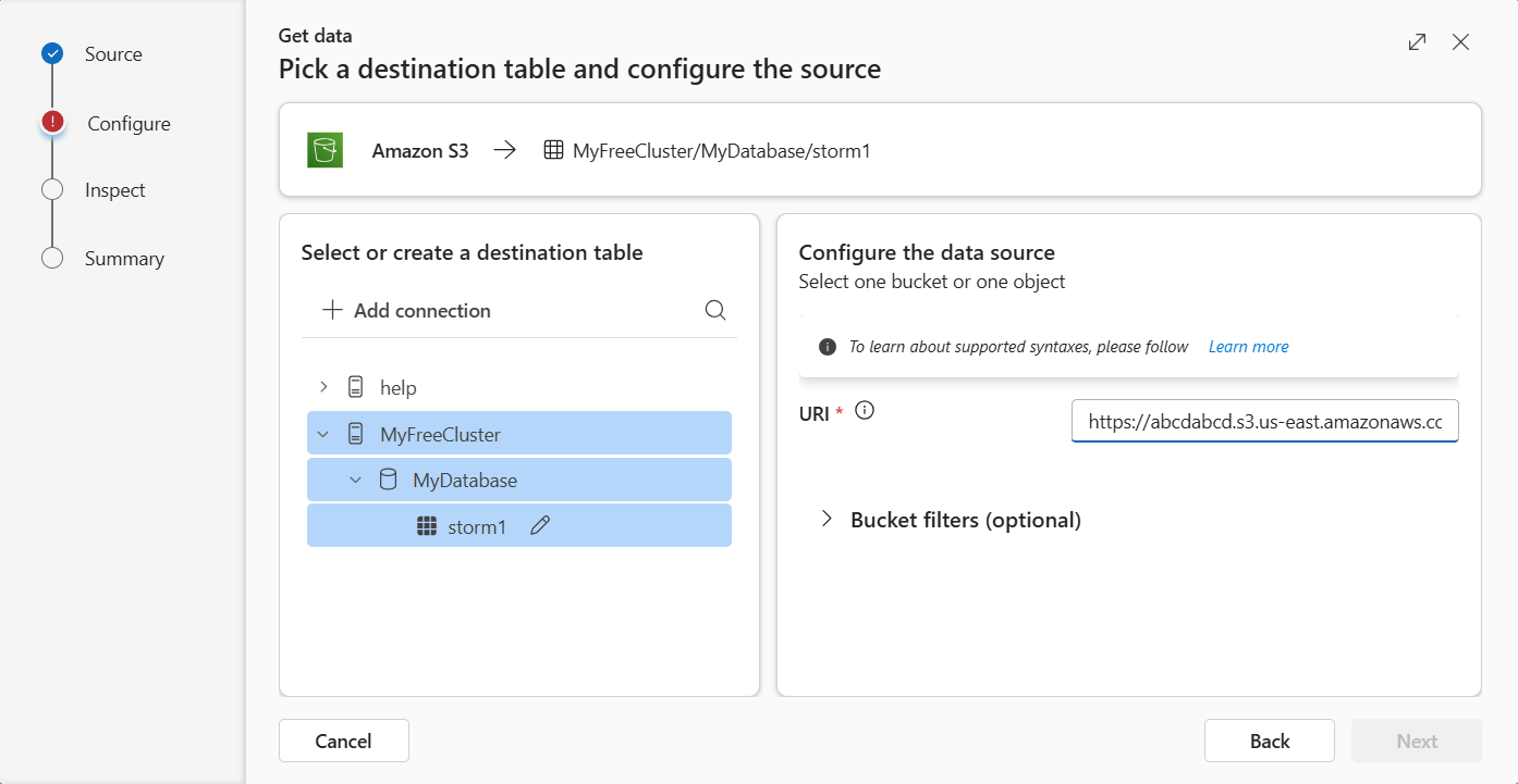 資料擷取是指將一個或多個來源的資料載入 Azure Data Explorer 中的資料表的過程。 資料匯入後,即可查詢。 在本文中,您將瞭解如何從 Amazon S3 取得資料到新的或現有的資料表。