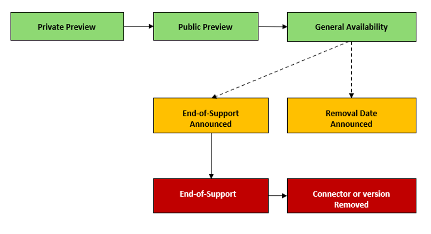 連接器生命週期包含多個階段,具有徹底且可測量的評量,以確保品質。 它包含私人預覽、公開預覽、正式運作、終止支援和已移除版本。 下表列出階段名稱和相關準則。