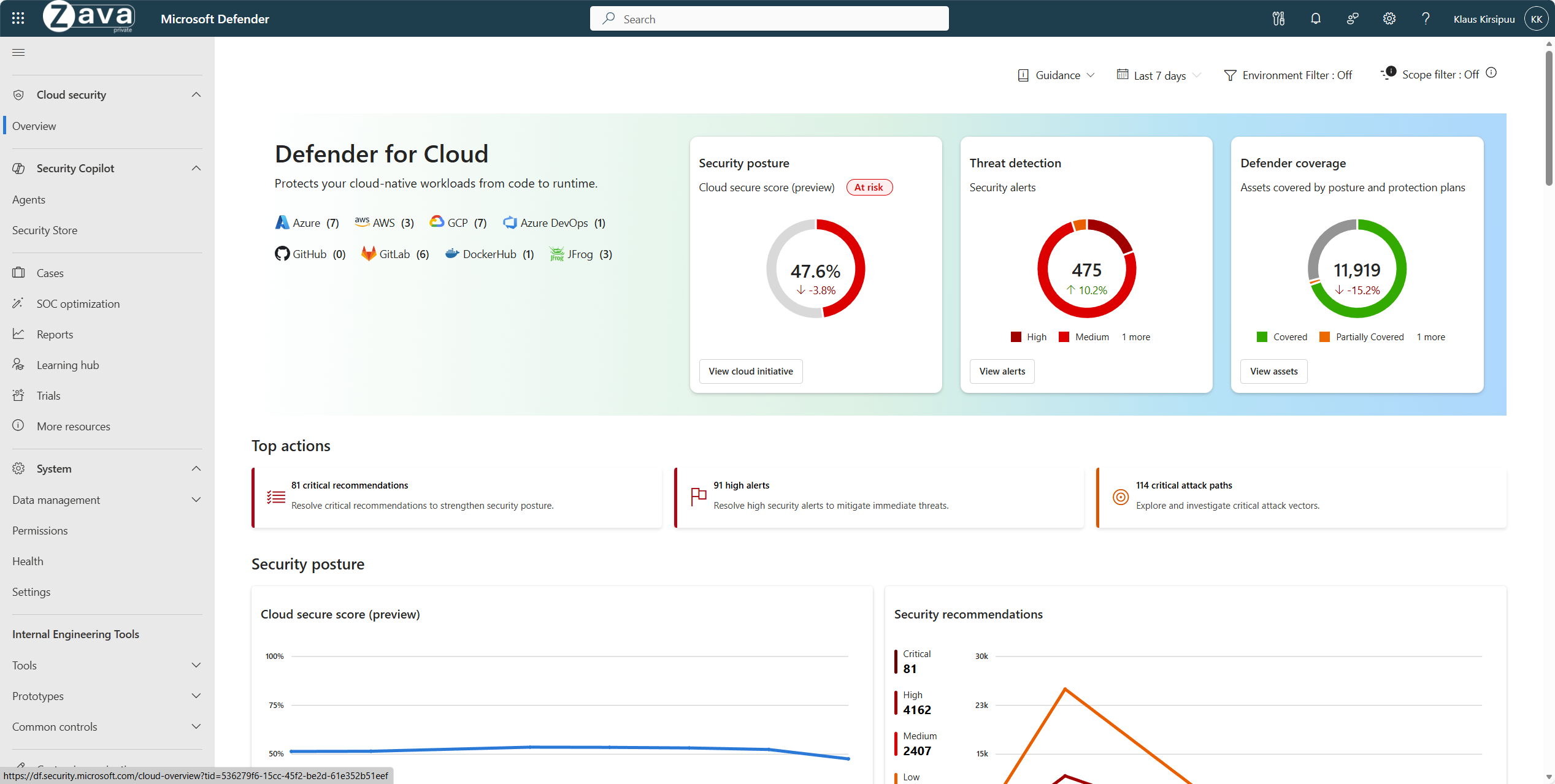 雲端概覽儀表板 - 雲端總覽儀表板集中管理態勢與威脅防護,讓安全人員能全面了解其環境。 它也會突顯可降低風險的優先改善行動、內含安全性深入解析的工作負載特定檢視,以及開箱即可用的長期安全性進度追蹤。