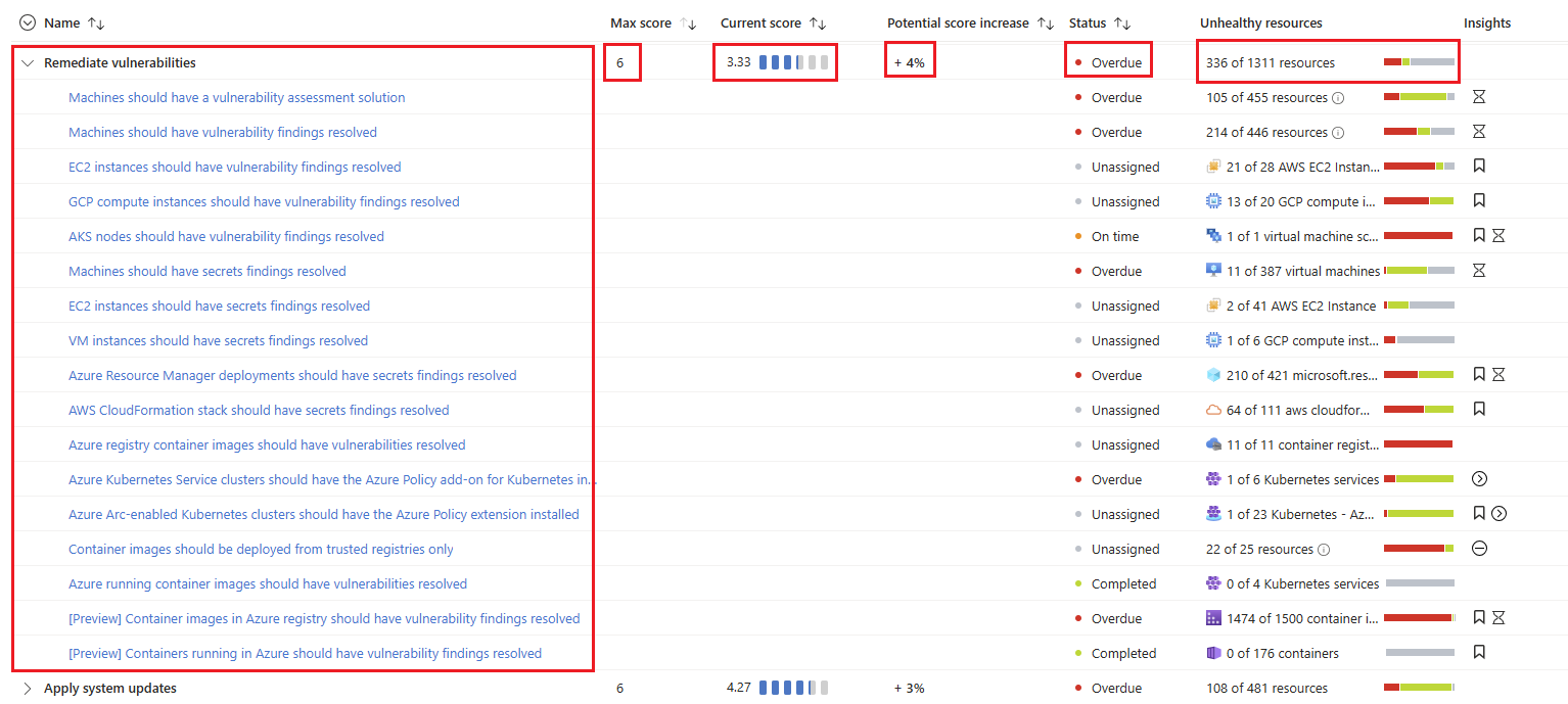 當您檢視多個訂用帳戶和連接器時,安全分數會評估所有已啟用原則中的所有資源,並加以分組。 分組會顯示這些資源如何共同影響每個安全性控制項的最高分。