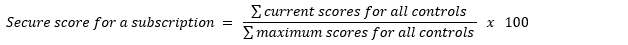 多個訂用帳戶和連接器的合併分數會包含每個訂用帳戶和連接器的「權數」。 Defender for Cloud 會根據線性加權模型,根據每個訂閱(不含「不適用」資源)的健康與不良資源總數,來決定你的訂閱與連接器的相對權重。 每個訂閱與連接器的當前分數計算方式與單一訂閱或連接器相同,然後套用其權重(見方程式)。 如果某訂閱或連接器對某個控制點沒有任何評估(沒有健康或不健康的資源),該控制項將被排除在該訂閱或連接器的分數計算之外。 這種情況下,控制項的目前或最大可能分數都不會計入該訂用帳戶的分數。 介面中所顯示的整體安全分數並不是每個訂閱百分比或控制計數的簡單算術平均值;而是跨訂閱加權後的總和。 因此,UI 中顯示的每個控制點資源數無法用來手動重新計算多個訂閱的整體安全分數。