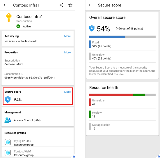 Azure 行動應用程式會以百分比值顯示安全分數。 點選以查看說明分數的詳細資料。