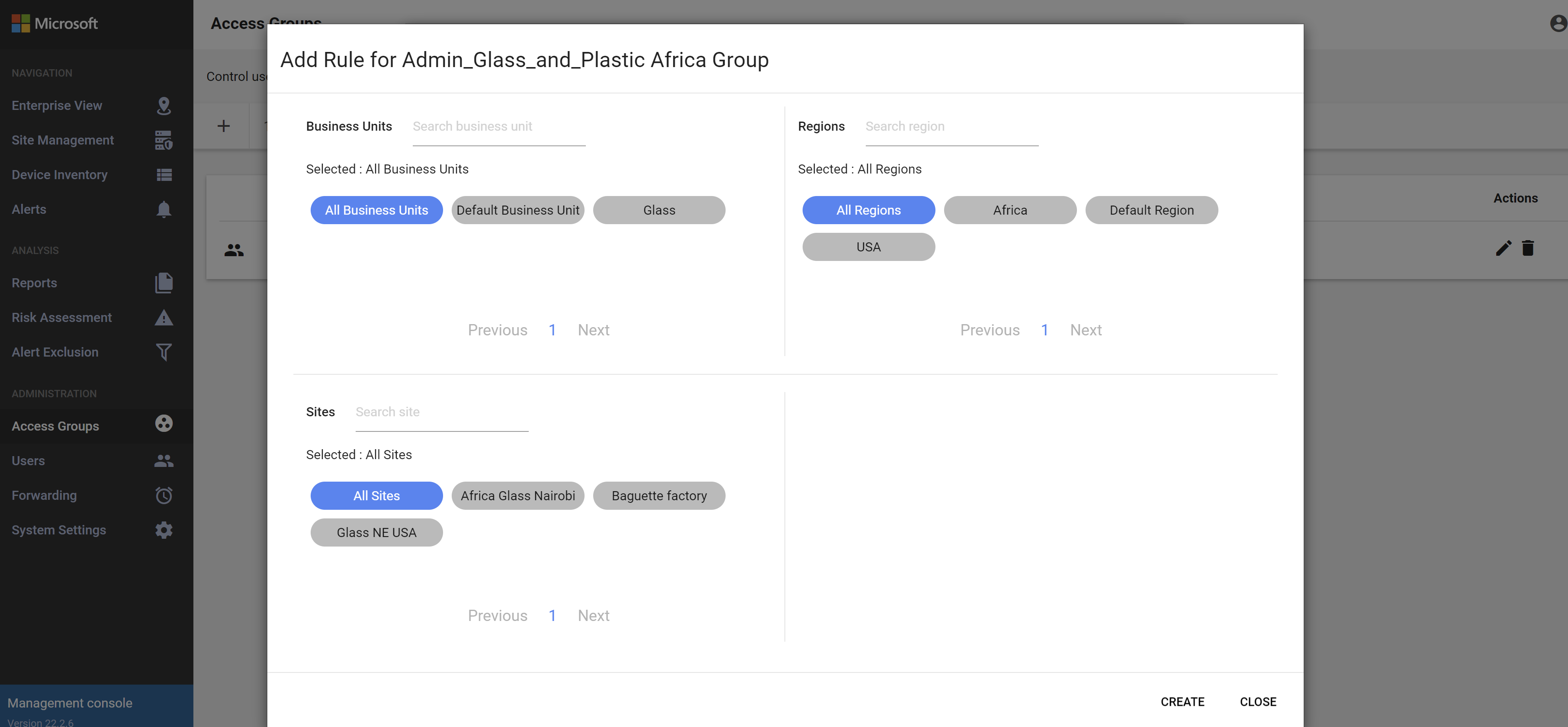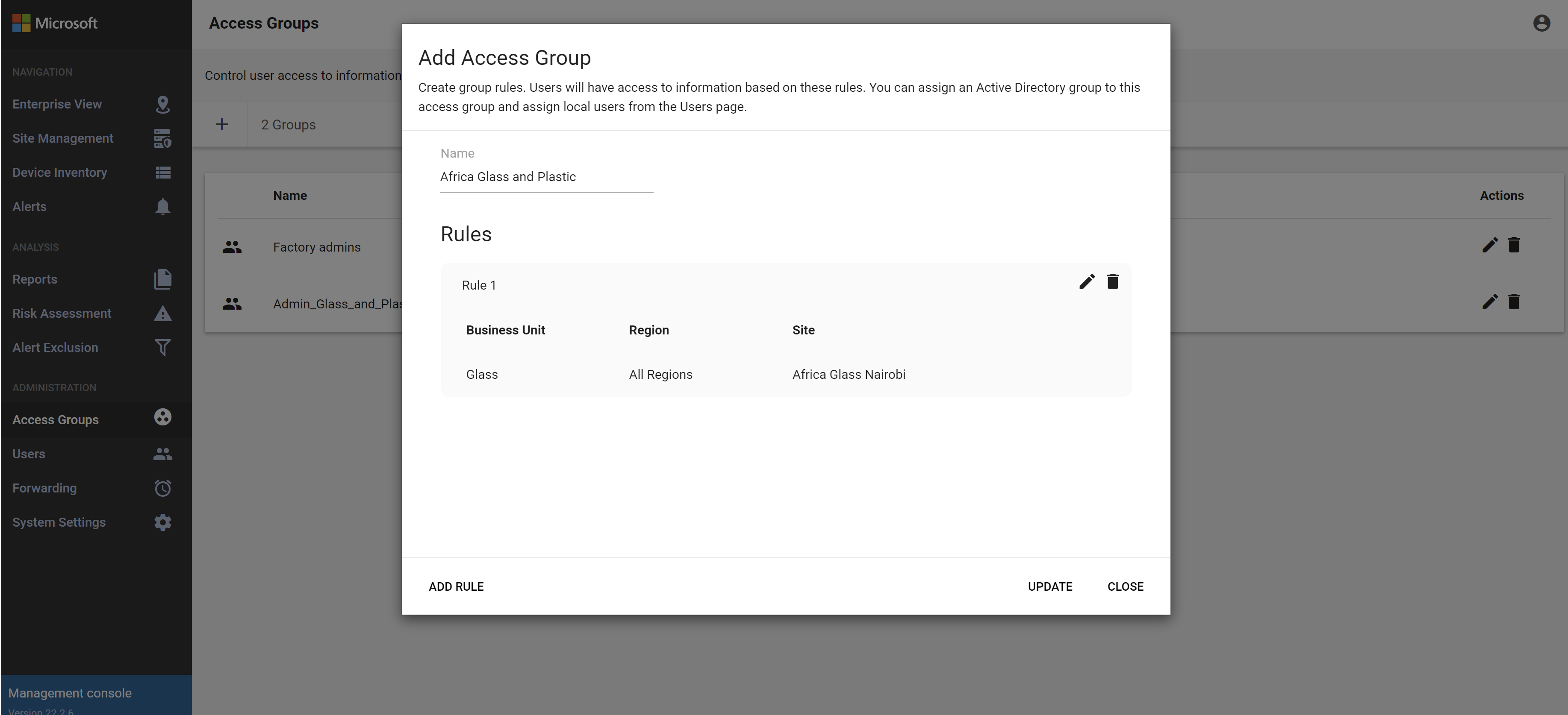 建立 [使用者存取群組],以跨適用於 IoT 的 Defender 內部部署資源建立全域存取控制。 每個存取群組都包含可存取商務拓撲中 (包括業務單位、區域和網站) 特定實體的使用者相關規則。