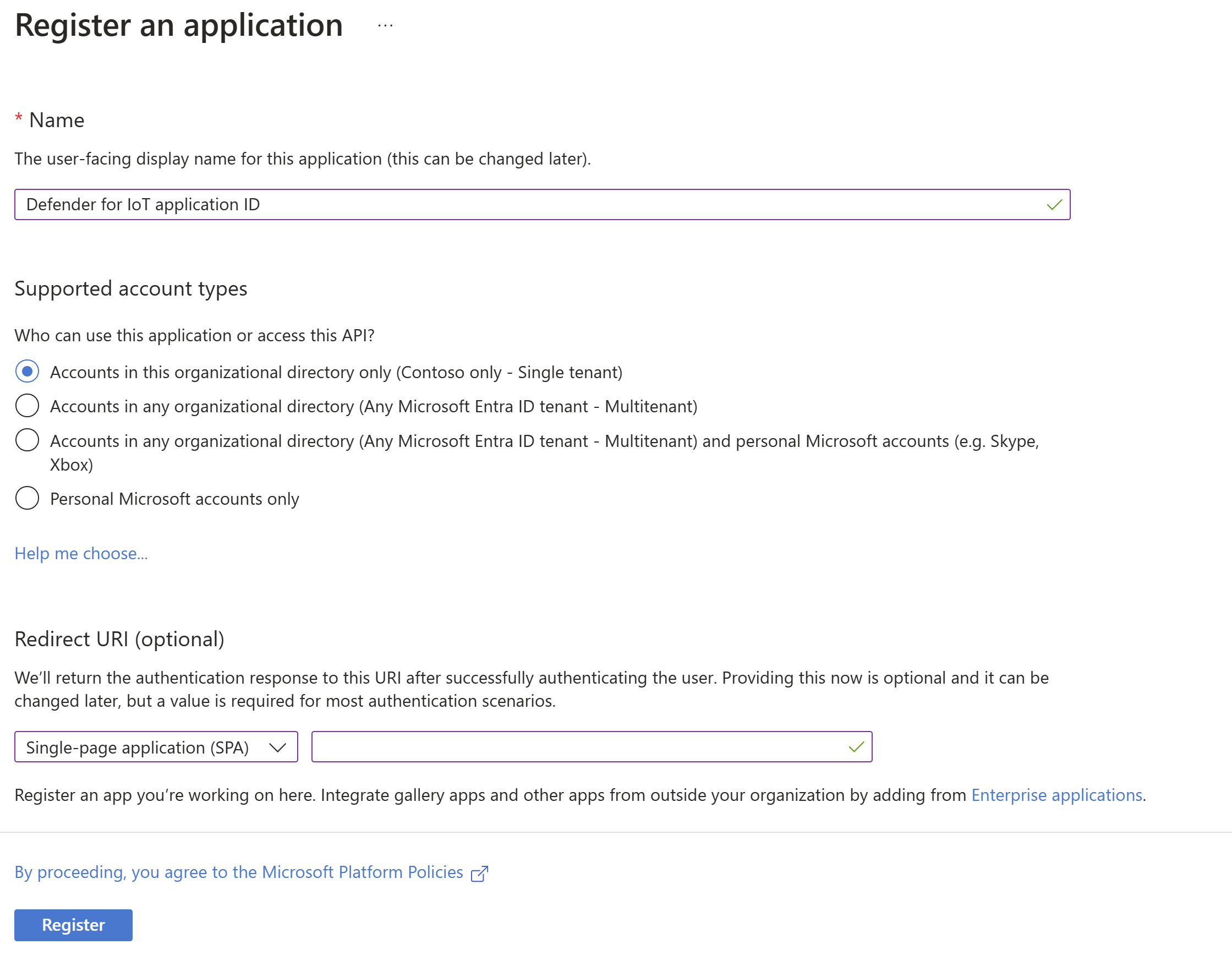 選取註冊。 Microsoft Entra ID 會顯示您新註冊的應用程式。