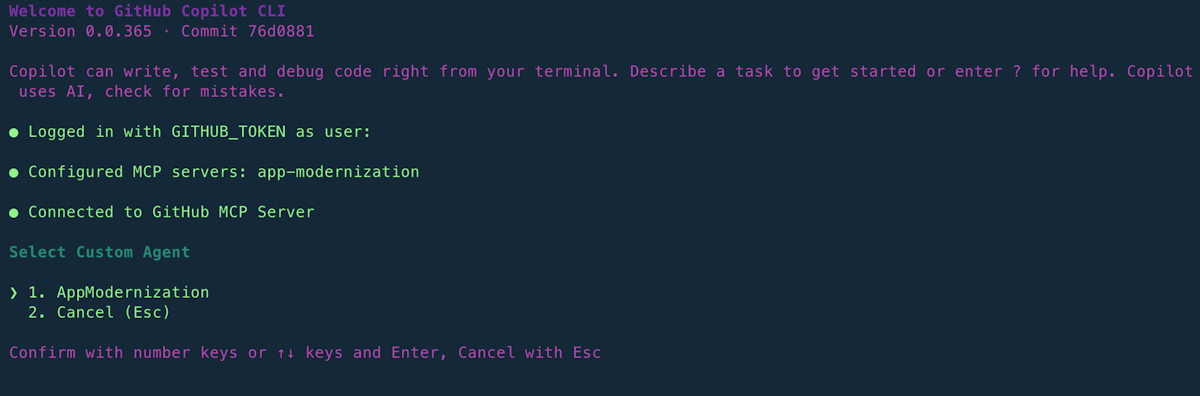 ~/.copilot/mcp-config.json{ "mcpServers": { "app-modernization": { "type": "local", "command": "npx", "tools": [ "*" ], "args": [ "-y", "@microsoft/github-copilot-app-modernization-mcp-server" ] } } }請執行