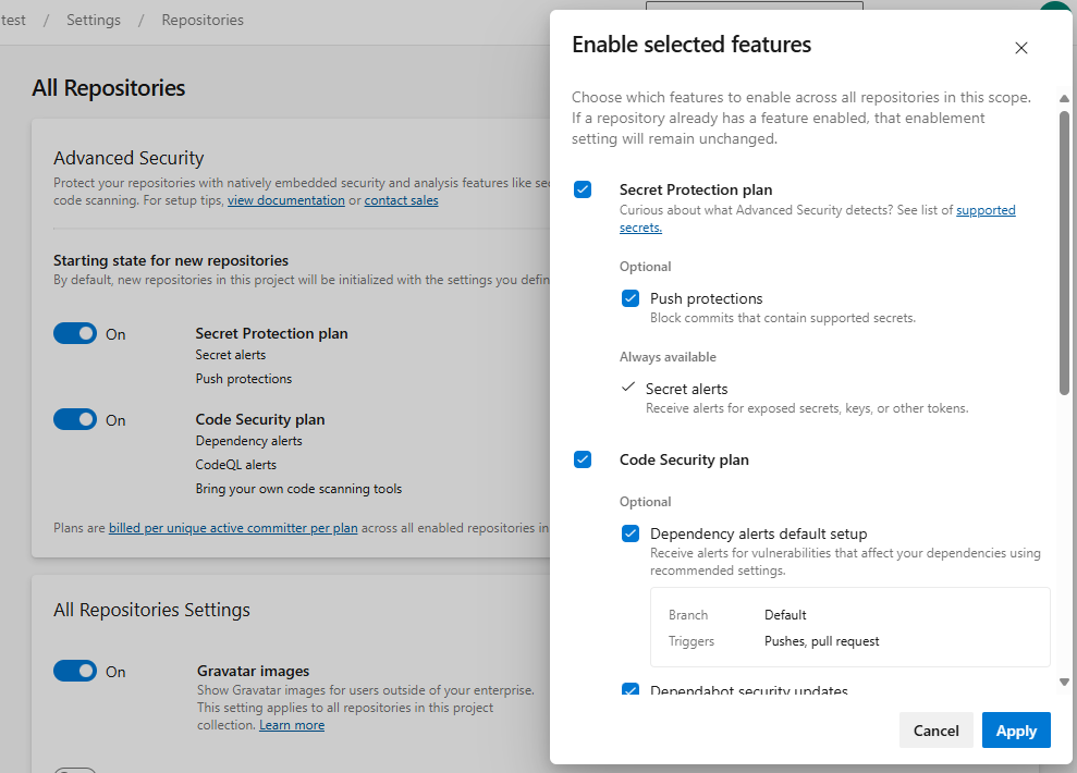 以前,使用者無法在專案或組織層級修改子功能,例如推播保護或依賴項掃描自動注入。 這些變更現在會在您選取 Enable all 之後,將您在存放庫層級看到的相同精細控制項應用於專案和組織的啟用體驗。