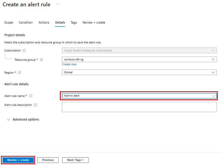 ![顯示 [建立警示規則] 索引標籤的螢幕擷取畫面,其中已醒目提示 [警示規則名稱]。](media/create-alerts/details-alert-name.png)