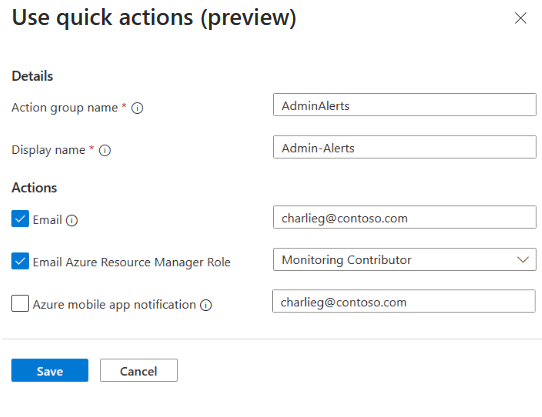 ![顯示 [使用快速動作 (預覽)] 窗格的螢幕擷取畫面。](media/create-alerts/quick-actions-preview.png)