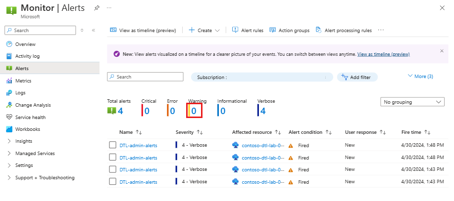 您會在 [警示] 中看到所有系統管理作業的警示 (在此範例中)。 警示可能需要一段時間才會顯示。