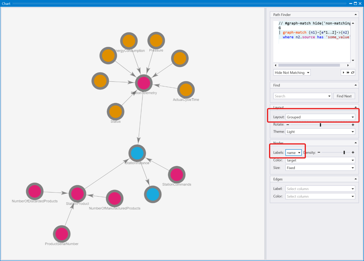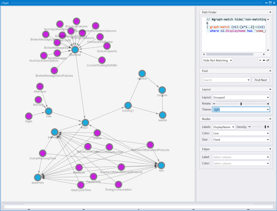若要檢視 OPC UA 資訊模型的圖形表示法,您可以使用 Kusto Explorer 工具。 若要轉譯月臺模型,請在 Kusto Explorer 中執行下列查詢。 為了獲得最佳結果,請將 Layout 選項變更為 Grouped ,並將 Labels 變更為 name: