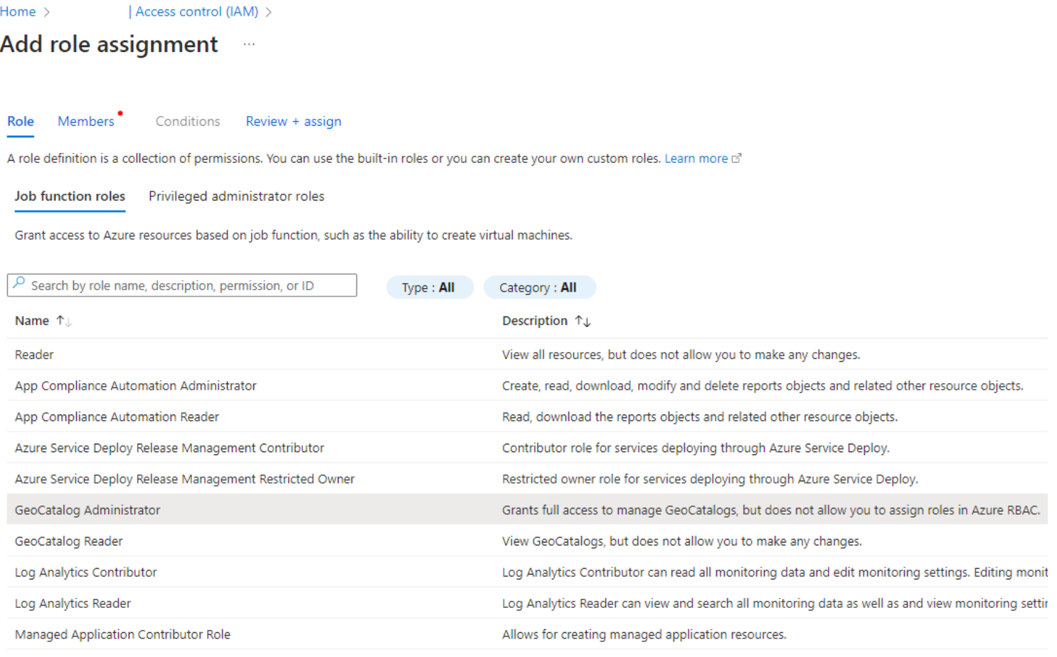 一旦您為在 Azure 上執行的應用程式建立了受控身份,或者為未在 Azure 上執行但已在 Microsoft Entra 中註冊的應用程式建立了服務主體,您需要透過 RBAC 設定將正確的權限授予這些身份,以便它們能夠存取 GeoCatalog 資源。