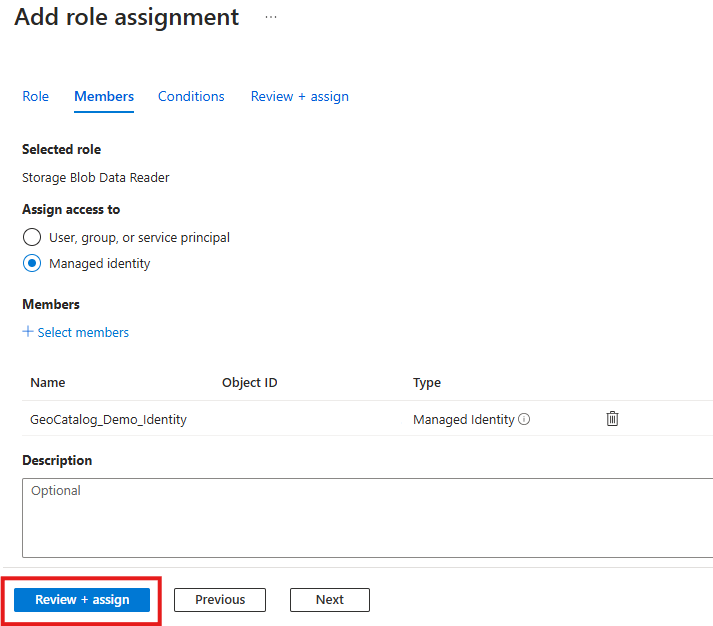 接下來,您將使用此受控識別,為 GeoCatalog 提供您數據所在 Blob 記憶體帳戶的讀取許可權。
