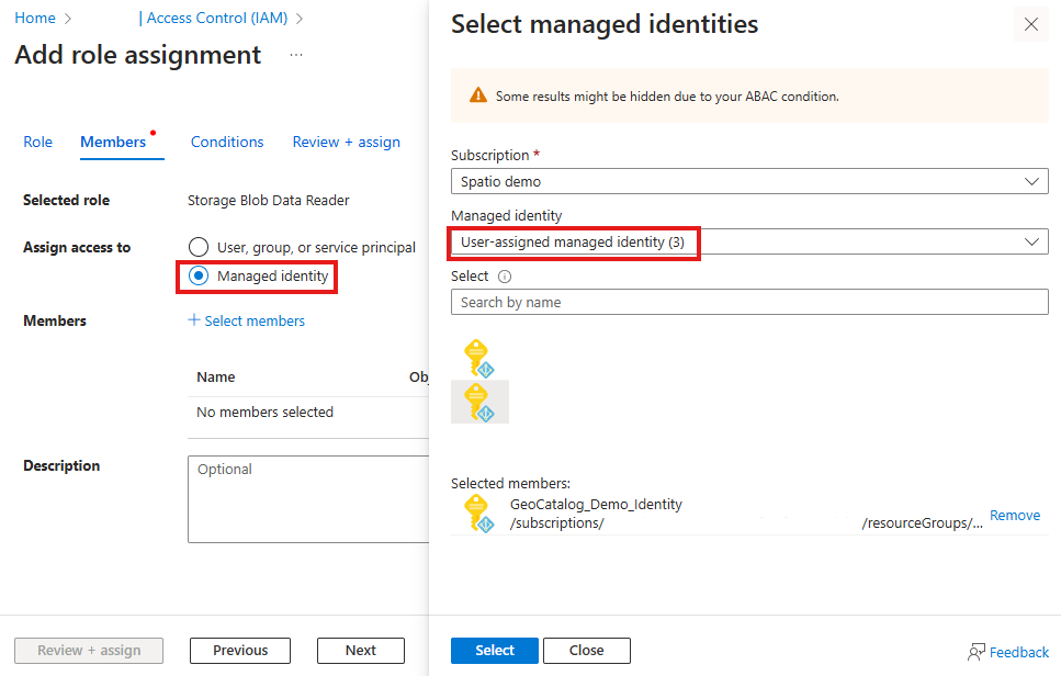 在 [成員] 窗格中,選取 [受控識別],這會開啟新的提要字段。 選取您在先前步驟中建立使用者指派受控識別的 訂閱,然後選取 使用者指派的受控識別。 選取使用者指派的受控識別,然後選取 [ 選取 ] 按鈕以繼續。