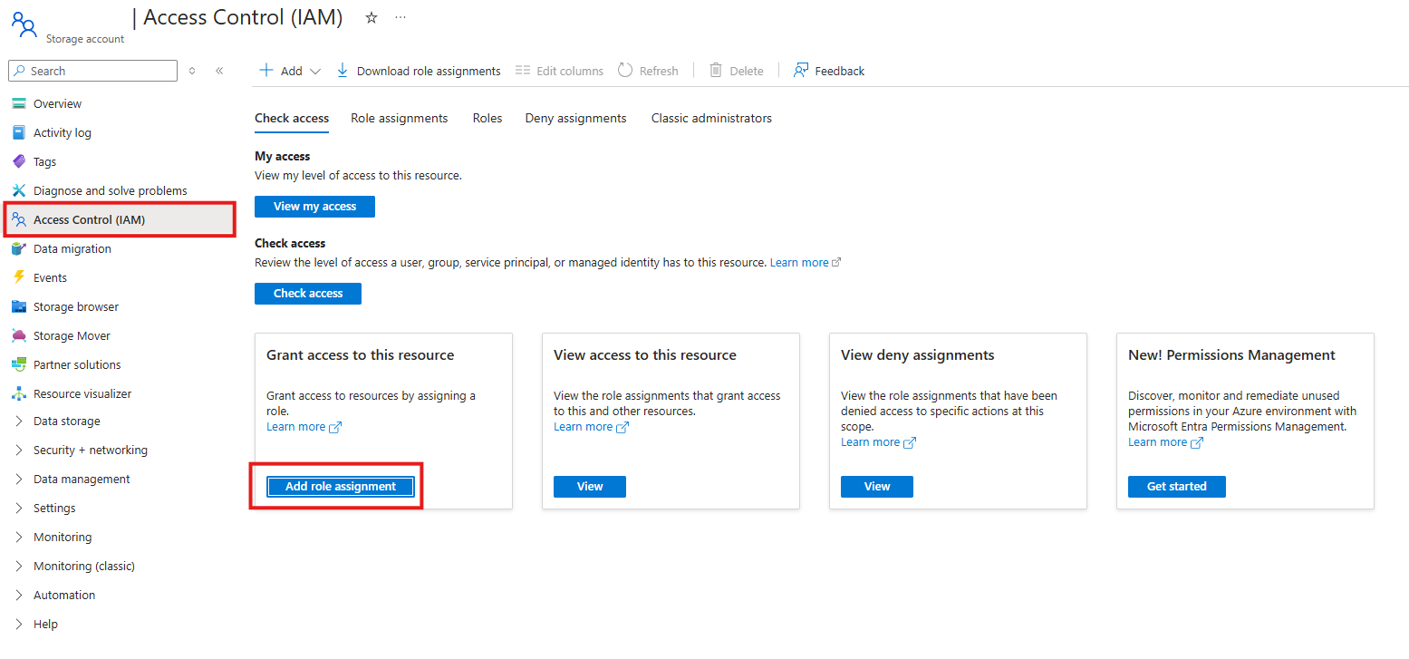 在 Azure 入口網站中,瀏覽至包含您想要匯入至 GeoCatalog 數據的儲存帳戶。 在該資源上,選取提要欄中的 [訪問控制][IAM] 按鈕,然後選取 [新增指派] 按鈕。