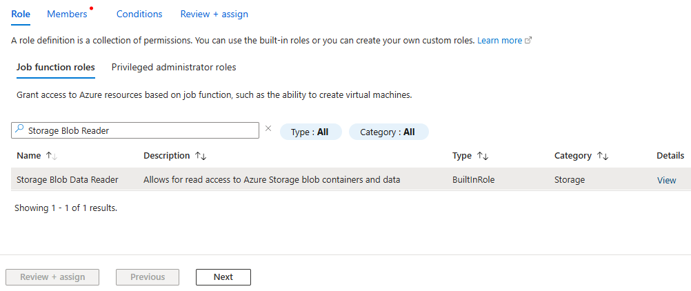接下來,在搜尋列中搜尋儲存體 Blob 資料讀取者角色。 選取 [ 記憶體 Blob 數據讀取器 ],然後按 [ 下一步] 按鈕。