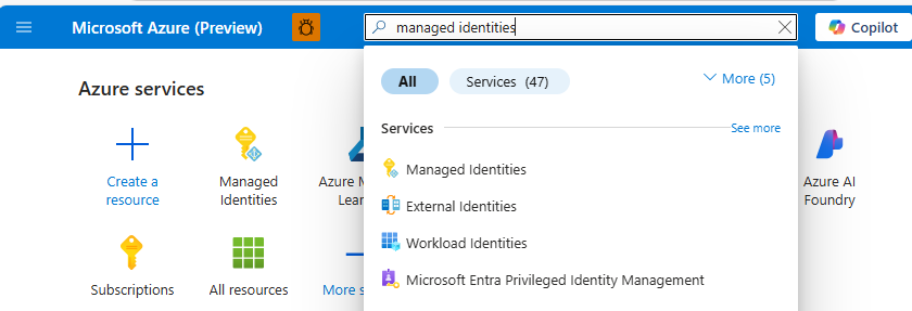流覽至 Azure 入口網站 以建立新的受控識別資源。 在搜尋列中,搜尋 受控識別。