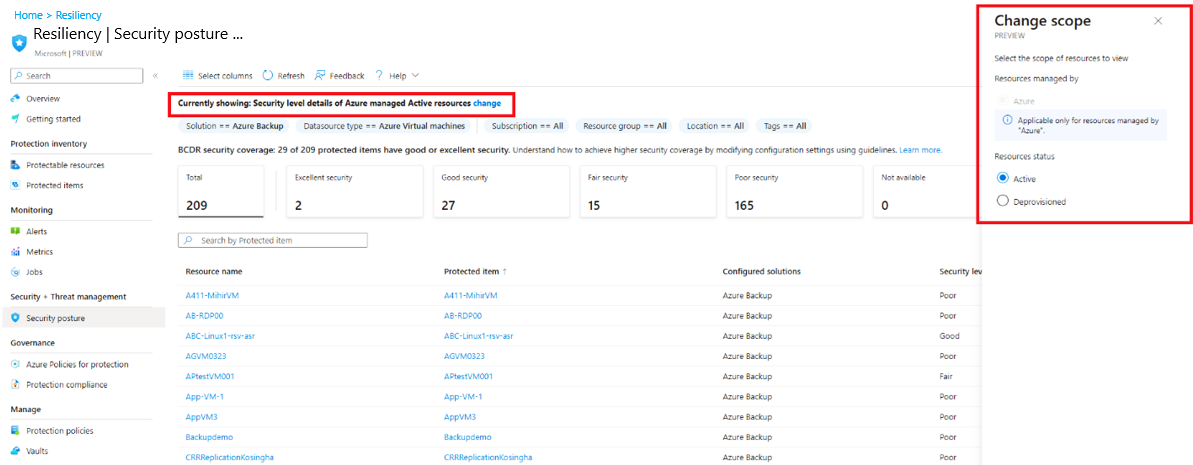 若要在韌性中使用 範圍選擇器 從 「目前顯示:Azure 管理的 Active 資源的保護狀態詳細資料」更改預設視圖,請選擇 「變更」。