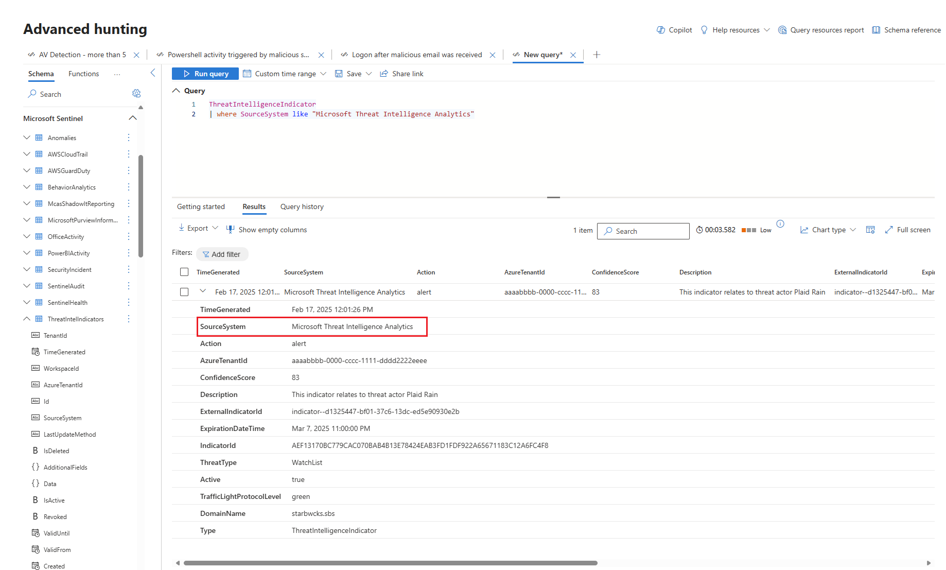 以下是 ThreatIntelligenceIndicators 資料表的範例。